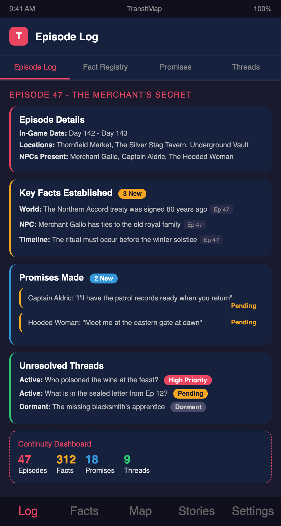 Running an actual play podcast and worried about continuity? Join the TransitMap waitlist — track every fact, promise, and storyline across your show's entire run with a visual system designed for the permanence of published audio.