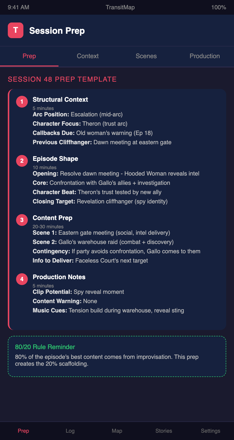 Want a session prep system designed for actual play production? Join the TransitMap waitlist — prep each session within the context of your show's visual narrative map, with structural position, character focus, and production notes all integrated.