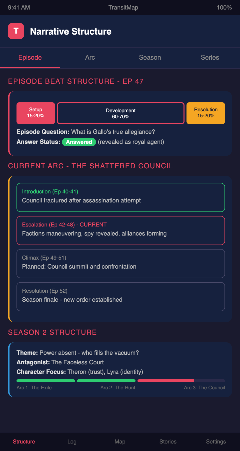 Want to give your actual play show deliberate narrative structure? Join the TransitMap waitlist — map episodes, arcs, and seasons as nested routes on a visual timeline, with structural beats, character focuses, and narrative milestones all visible at a glance.