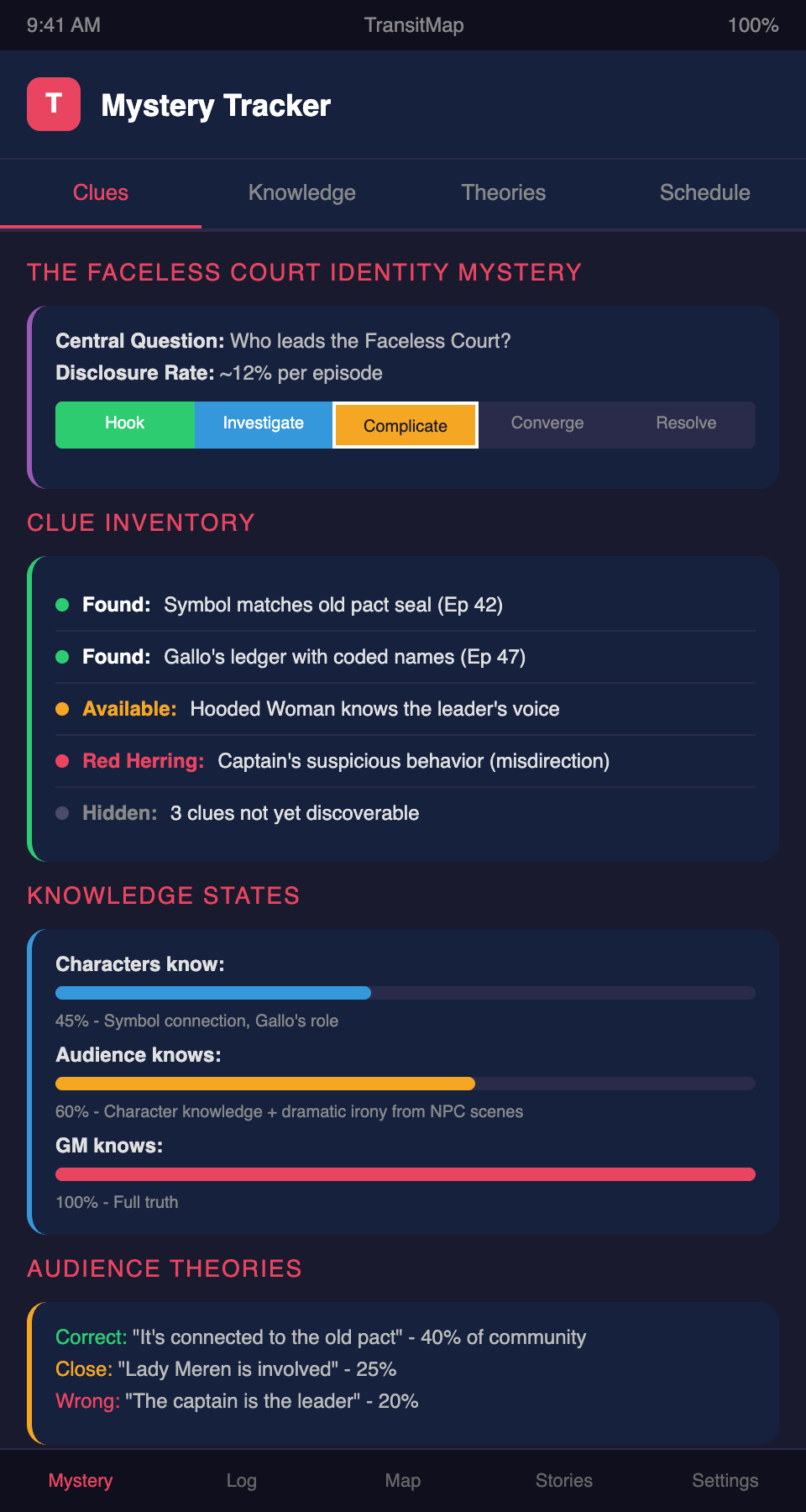 Sustaining a mystery across your show's episodes? Join the TransitMap waitlist — map your mystery's clue network as interconnected transit stops, with revelation timing and audience knowledge state tracked visually across your episode timeline.