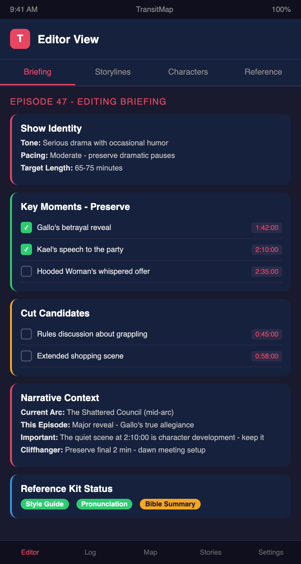 Onboarding a new editor for your actual play show? Join the TransitMap waitlist — give your editor a visual map of your show's storylines so they can understand the narrative context of every scene they edit.