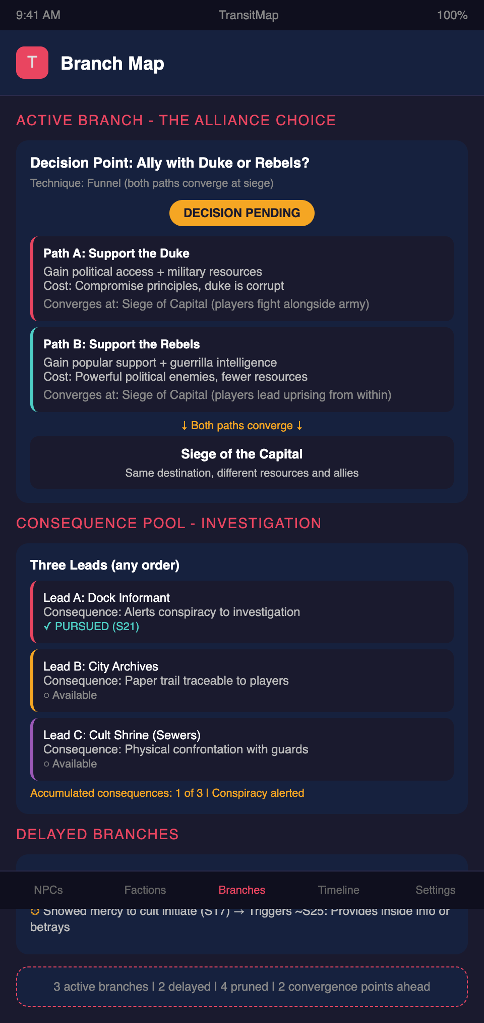 Want to design and track branching storylines without drowning in complexity? Join the TransitMap waitlist — map your campaign's branches as transit routes that split at junctions and merge at transfer stations, keeping every possible path visible and manageable.