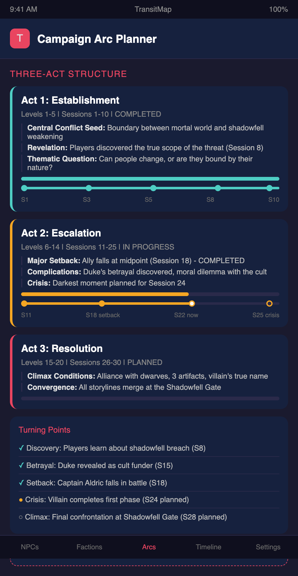 A campaign arc is the overarching narrative structure that gives meaning to individual sessions and adventures. It is the answer to the question your players will ask when the campaign ends: "What was that story actually about?"