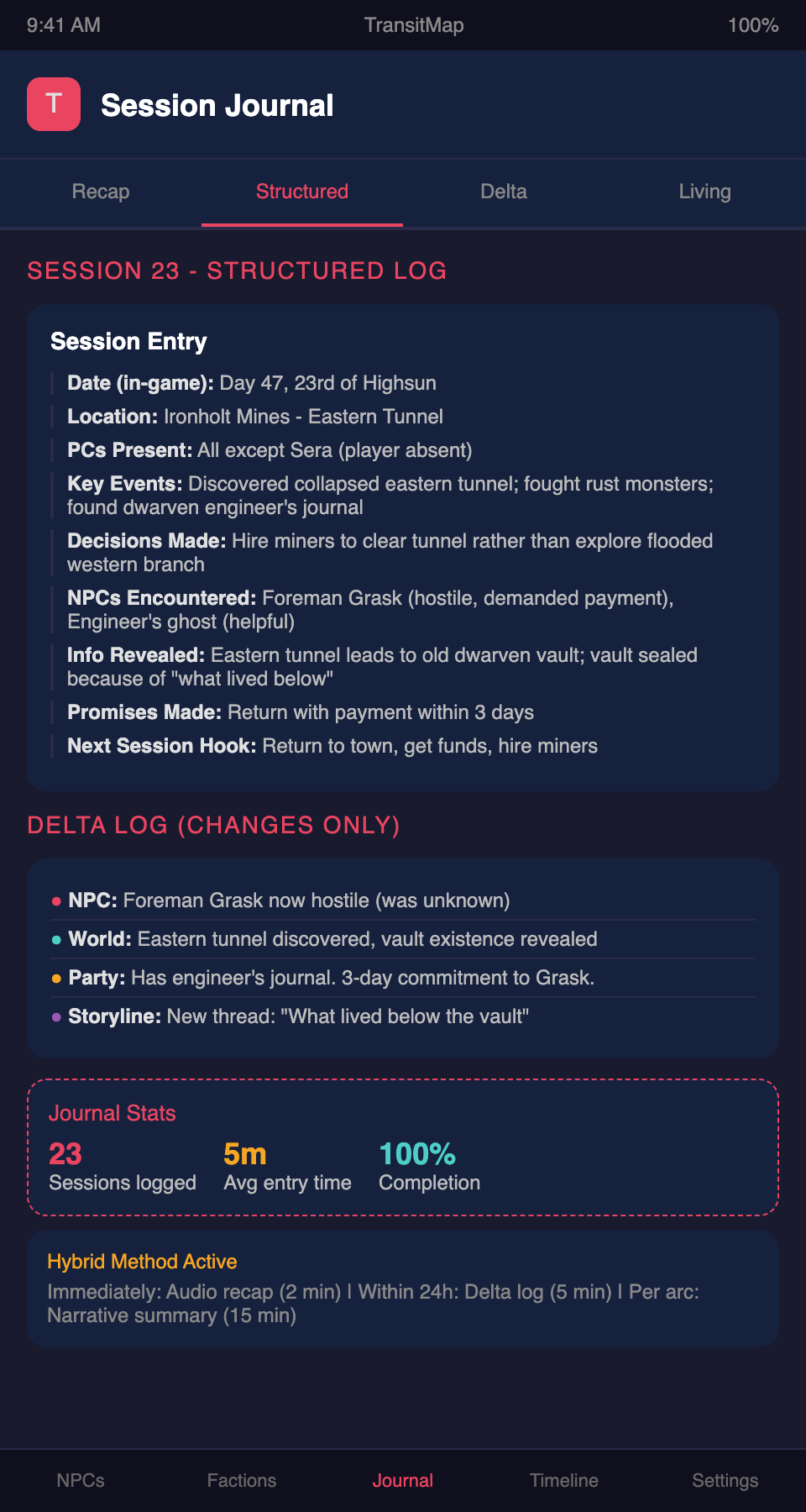 Want a journaling system that integrates directly with visual storyline tracking? Join the TransitMap waitlist — update your campaign state and see it reflected on your narrative map instantly, so your journal and your tracker are always in sync.