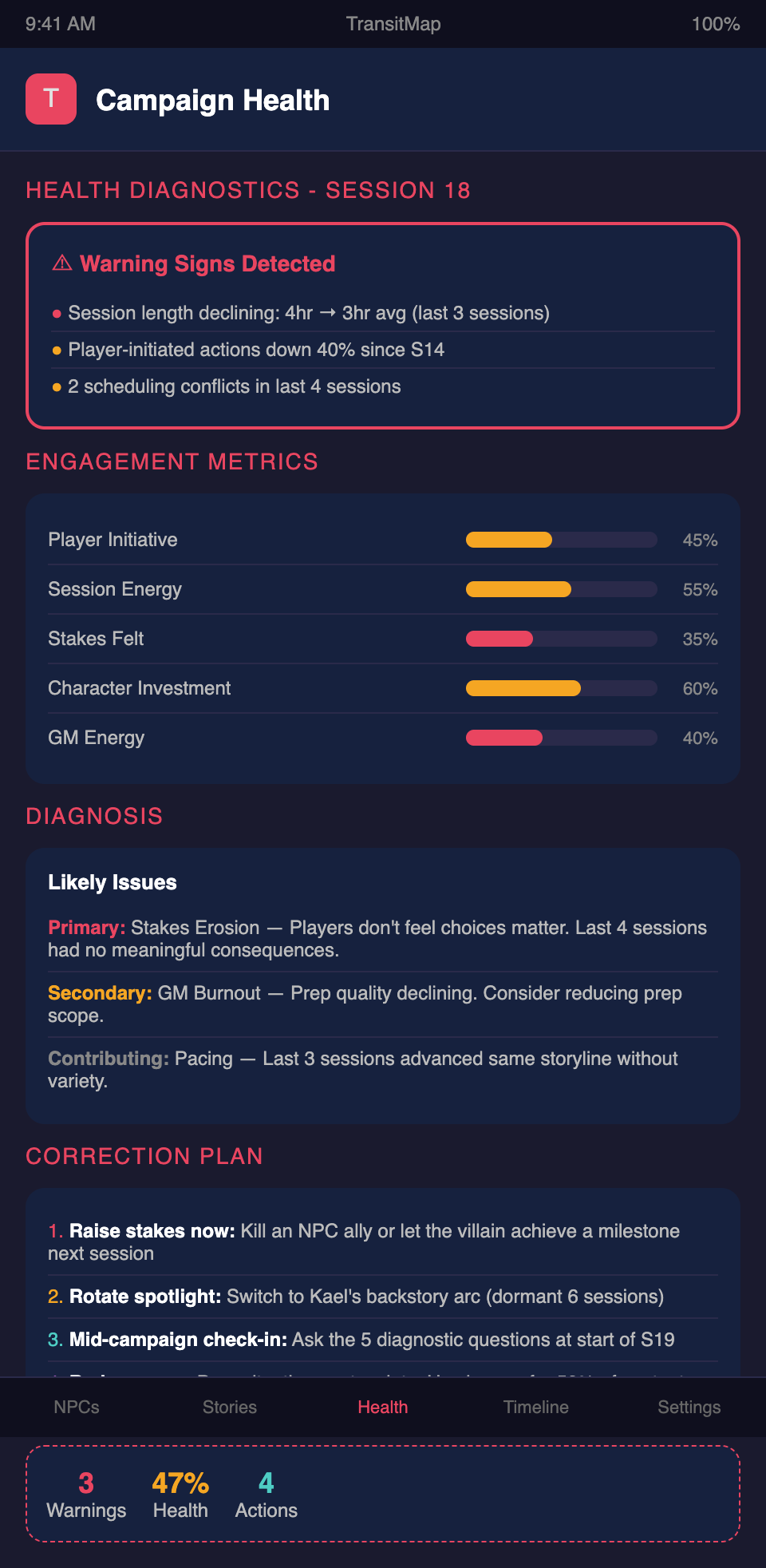 Need to see your campaign's big picture so you can identify what needs fixing? Join the TransitMap waitlist — view your storylines, pacing, and player engagement visually, and spot problems before they become crises.