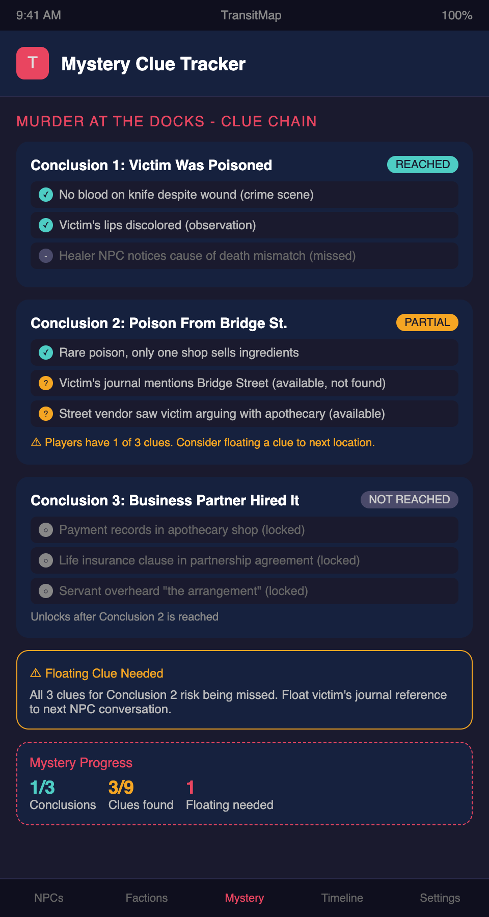 Building a mystery campaign and need to track every clue, conclusion, and information chain? Join the TransitMap waitlist — map your mystery as a transit network where clue lines converge at conclusion stations, and never lose track of what your players know.