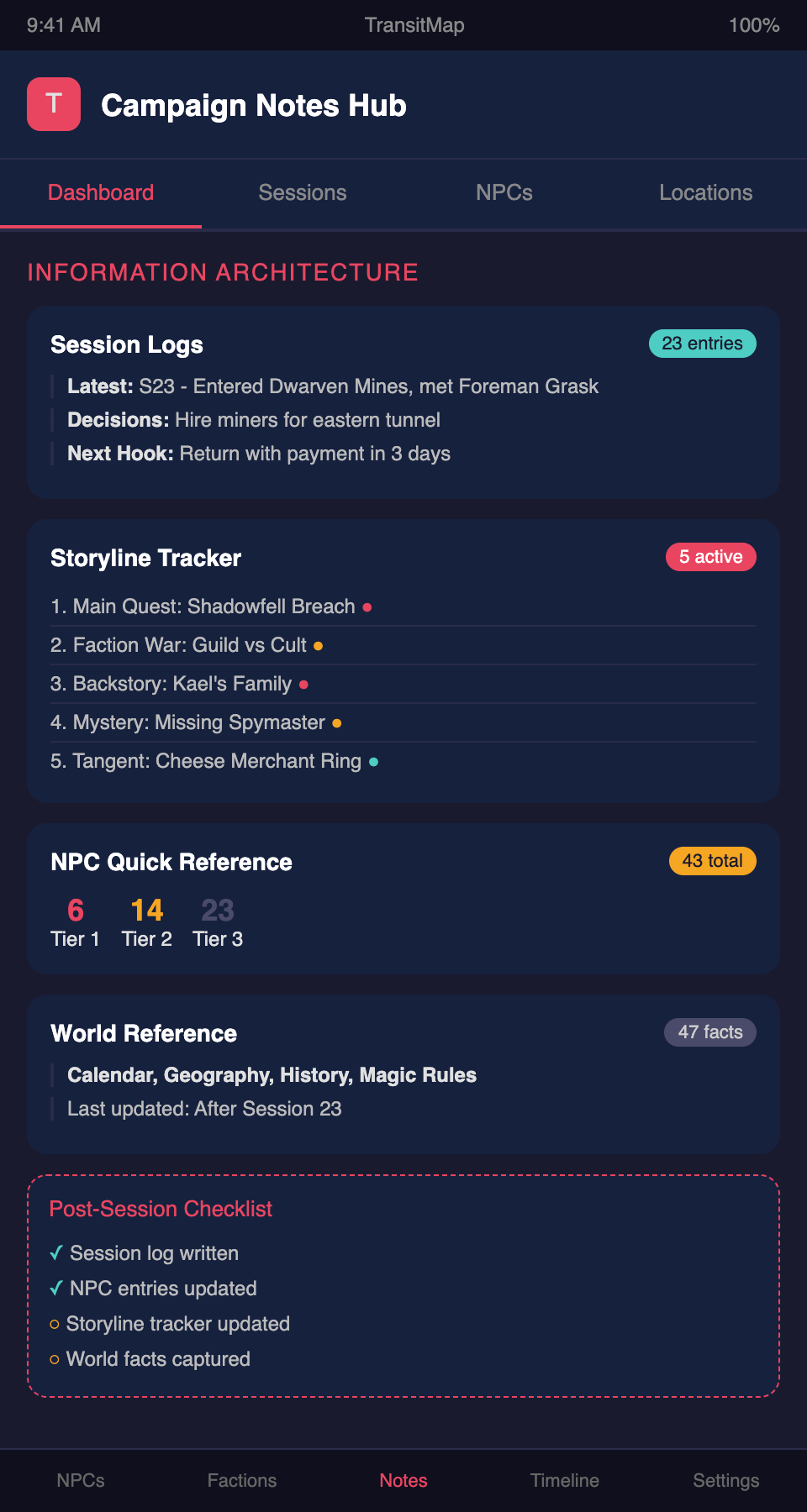 Looking for a note-taking system built specifically for campaign storyline tracking? Join the TransitMap waitlist — a visual organization tool that maps your campaign's storylines, NPCs, and events like a transit network you can navigate at a glance.