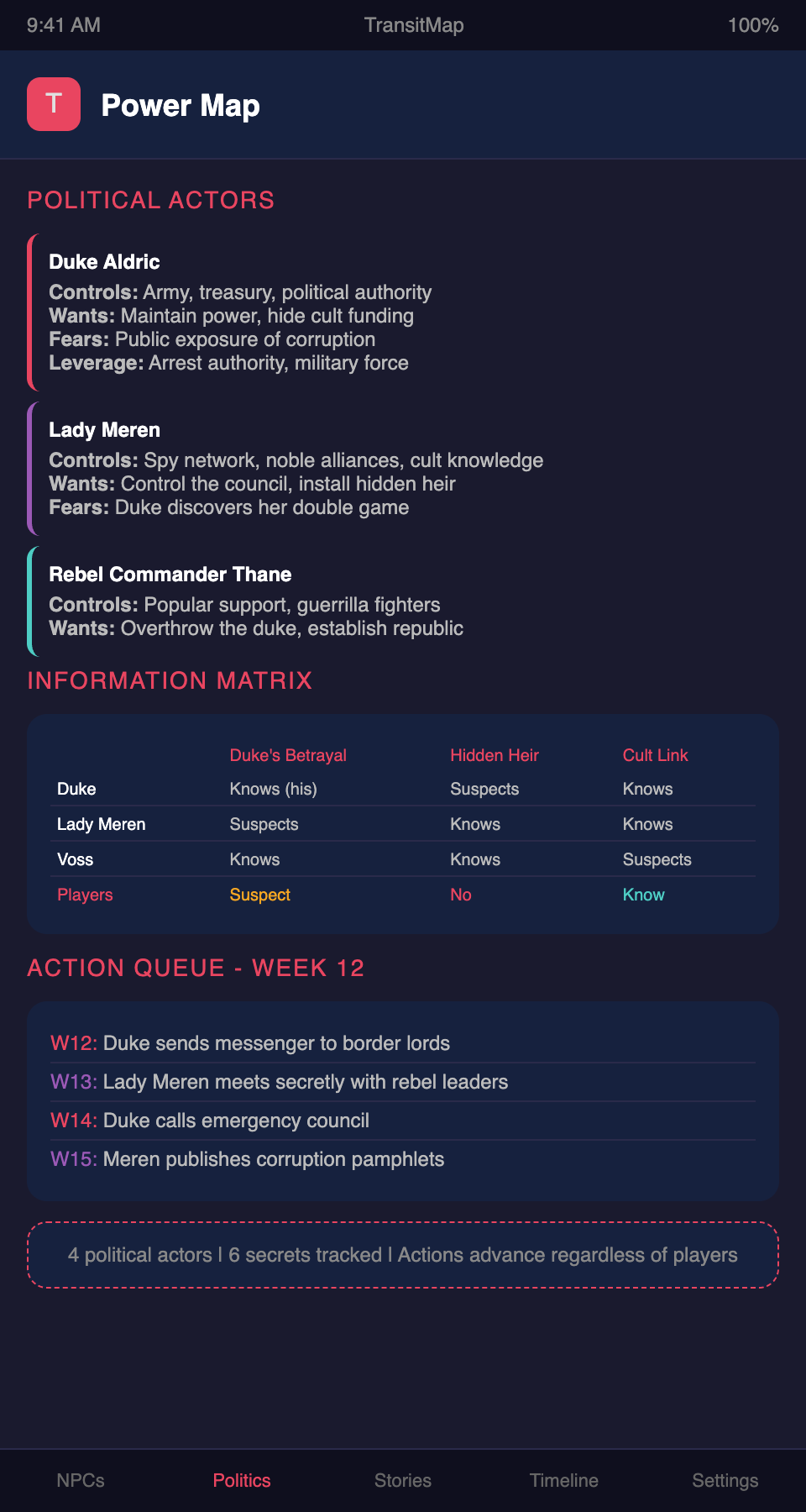 Drowning in the complexity of your political intrigue campaign? Join the TransitMap waitlist — map every power player, alliance, and secret agenda as lines on a political transit map, and track how every move reshapes the network.