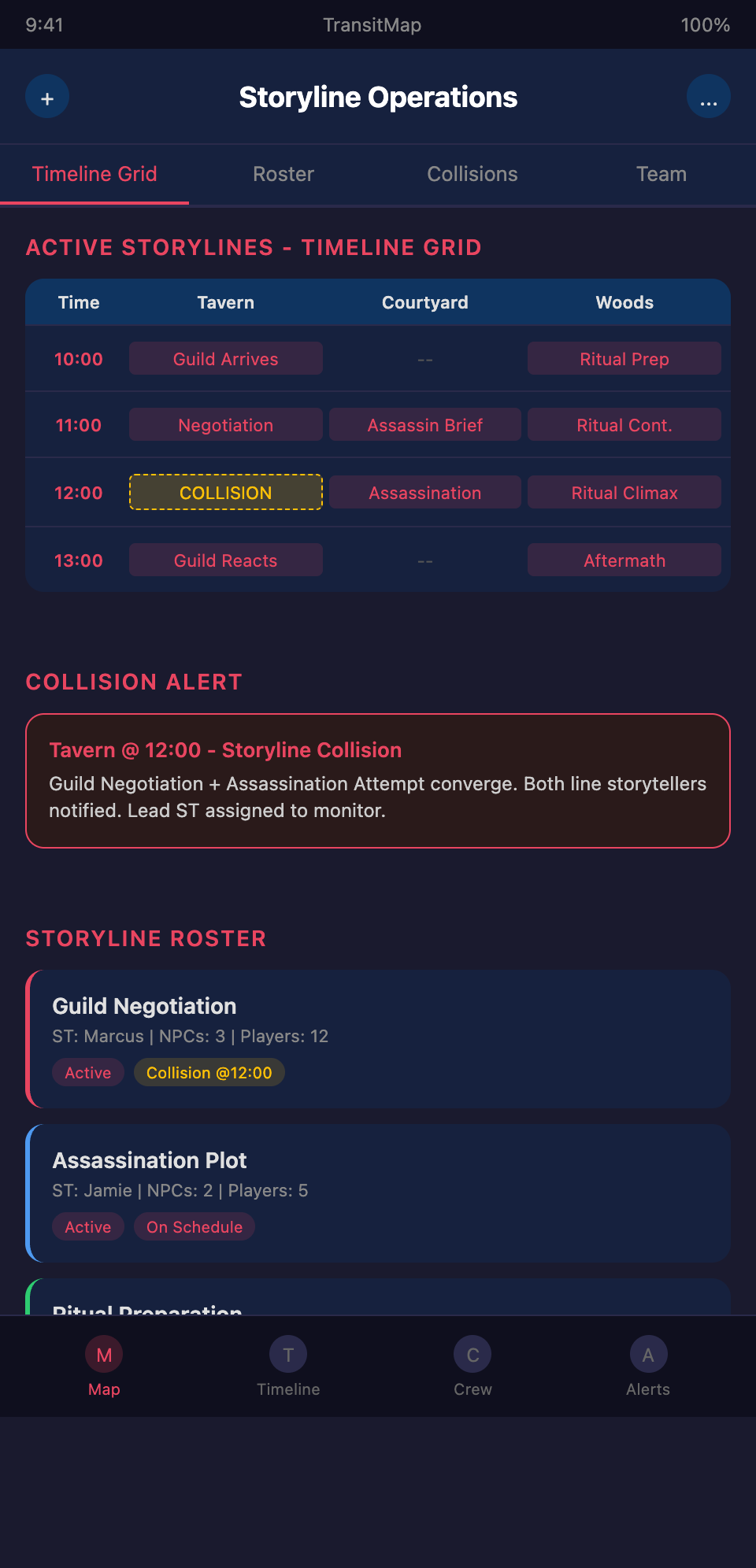 Running a multi-storyline LARP and need a coordination system that keeps every plotline visible? Join the TransitMap waitlist — manage simultaneous storylines as parallel transit lines with collision points, timing, and crew assignments all mapped in one view.