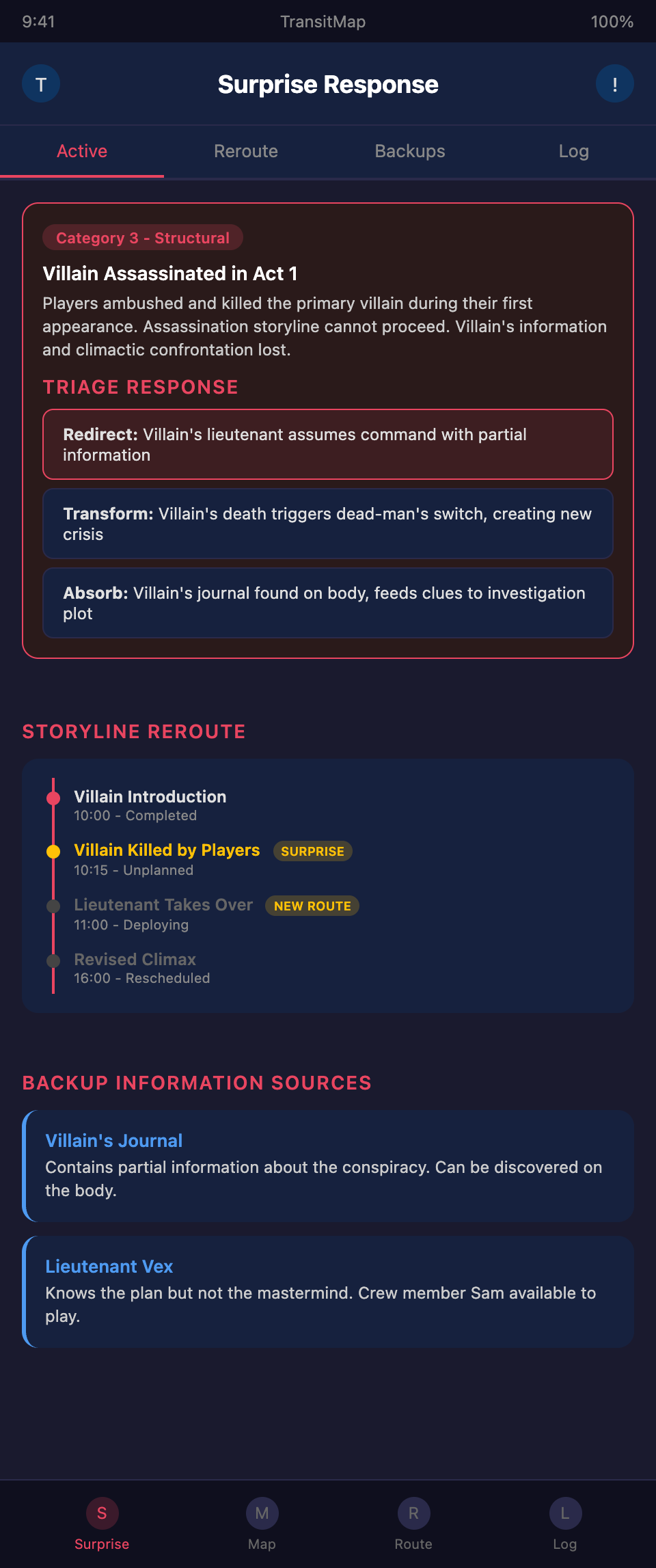 Want a system that helps you anticipate and respond to player surprises? Join the TransitMap waitlist — track your storylines as flexible transit routes that can be rerouted in real time, with alternative paths always visible when the unexpected happens.