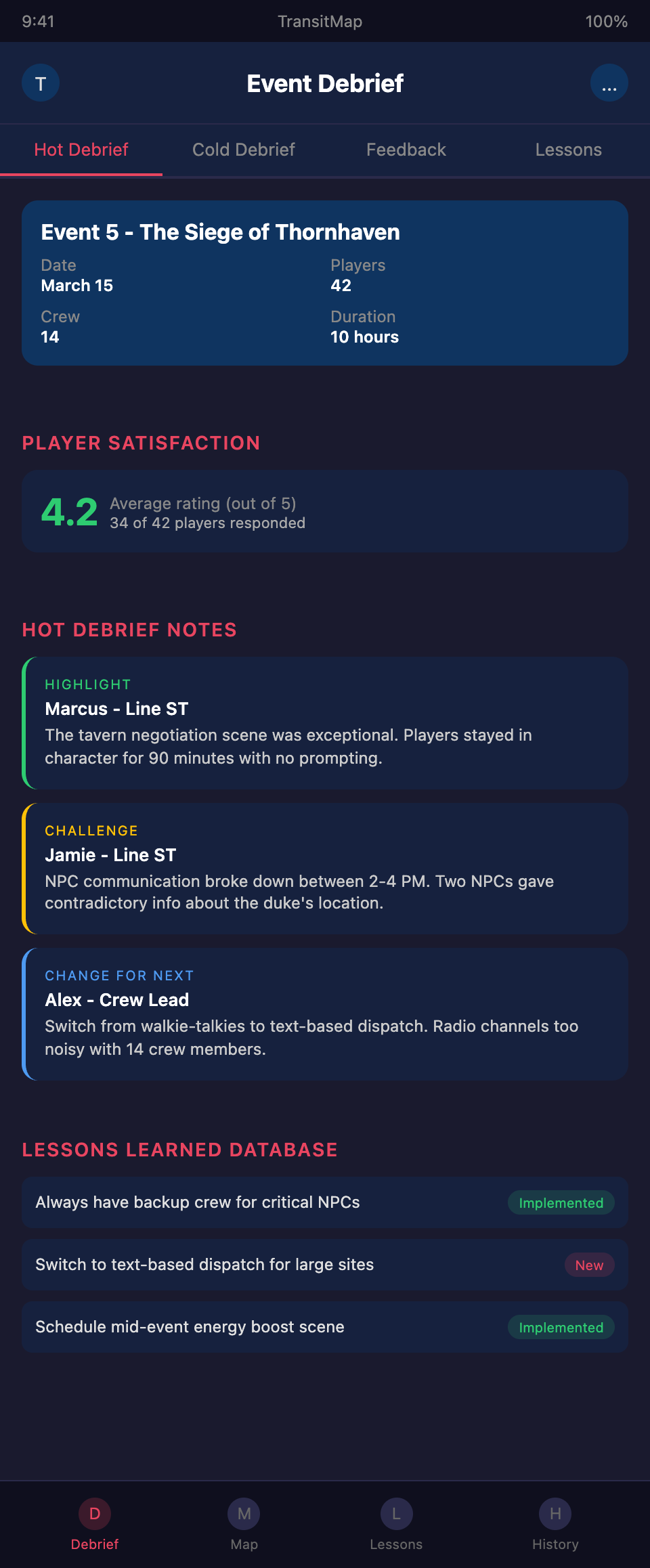 Want to track lessons learned and event improvements across your entire LARP campaign? Join the TransitMap waitlist — build a visual record of your event series where every lesson, improvement, and storyline evolution is mapped across your campaign's history.