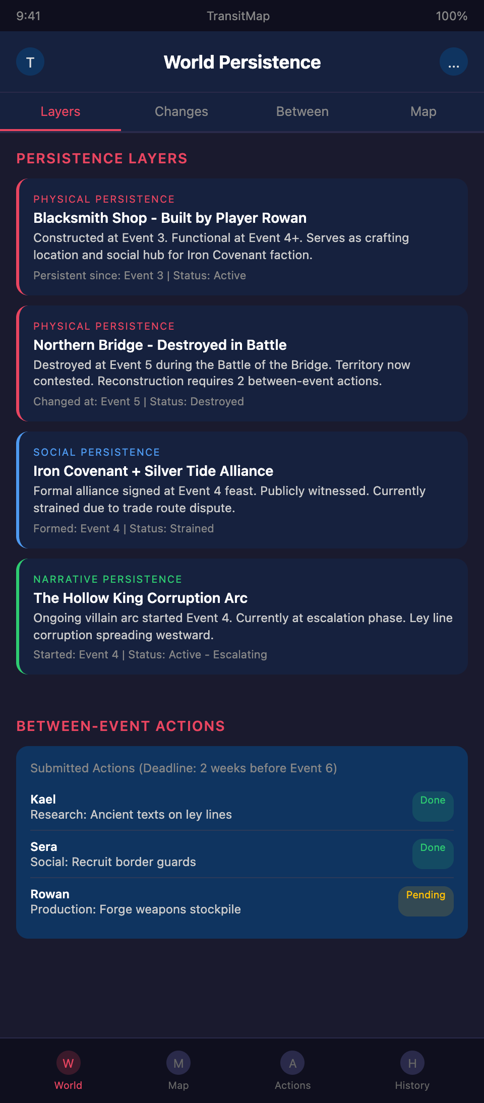 - A canonical map updated after each event showing territory, structures, and physical changes