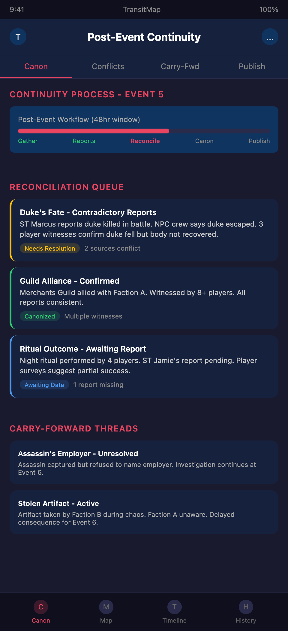 Need a system to manage post-event continuity across your LARP campaign? Join the TransitMap waitlist — track canonical events, carry-forward threads, and world state changes on a visual timeline that grows with every event.