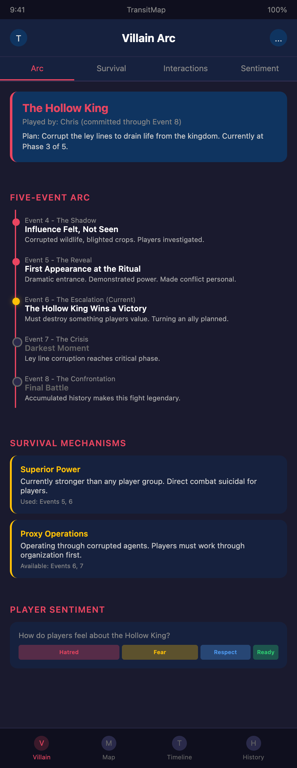 Building a recurring villain arc for your LARP campaign? Join the TransitMap waitlist — map the antagonist's storyline as a dark transit line running parallel to the players' journey, with confrontation points, survival mechanisms, and escalation milestones all tracked visually.