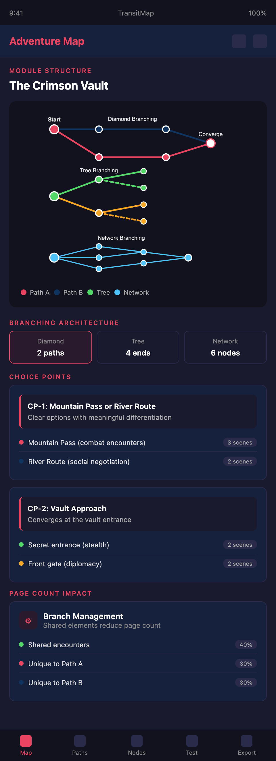 Designing a branching adventure and losing track of how all the paths connect? Join the TransitMap waitlist — map every branch, choice point, and convergence as a visual transit network that shows your entire adventure's structure at a glance.