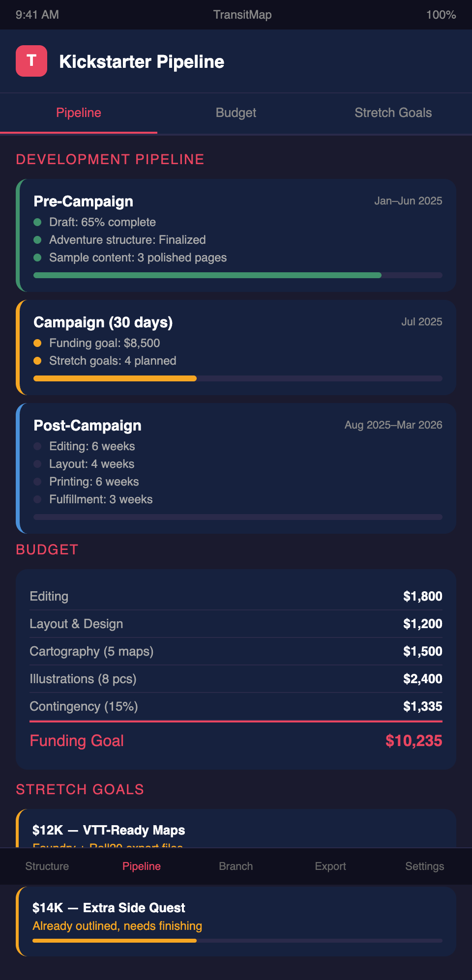 Planning a Kickstarter for your RPG module? Join the TransitMap waitlist — map your entire development pipeline as a visual transit network, track milestones, manage stretch goal content, and keep your project on schedule from concept to fulfillment.