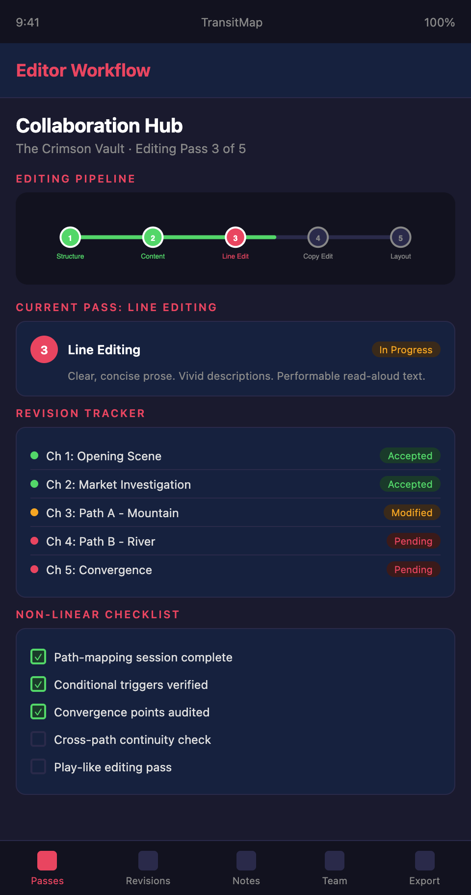Collaborating with an editor on a complex module? Join the TransitMap waitlist — share your adventure's visual structure with your editing team, track revision status across branches and scenes, and ensure nothing falls through the cracks during the editing process.